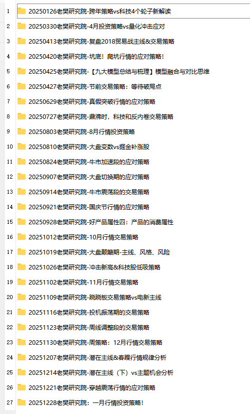 老樊研究院2025年周策略合集 ├──20250126老樊研究院-跨年策略vs科技4个轮子新解读 |└──20250126老樊研究院-跨年策略vs科技4个轮子新解读.pdf15.94M ├──20250330老樊研究院-4月投资策略vs量化冲击应对 |└──20250330老樊研究院-4月投资策略vs量化冲击应对.pdf2.67M ├──20250413老樊研究院-复盘2018贸易战主线&交易策略 |├──复盘2018贸易战主线&交易策略.pdf2.39M |└──复盘2018贸易战主线&交易策略!.mp4171.89M ├──20250420老樊研究院-坑底!爬坑行情的应对策略! |├──坑底!爬坑行情的交易策略.mp4149.48M |└──坑底!爬坑行情的应对策略!20250420.pdf2.10M ├──20250425老樊研究院-【九大模型总结与梳理】模型融合与对比思维 |├──【九大模型总结与梳理】模型融合与对比思维.mp455.89M |└──九大交易模型总结篇.pdf2.23M ├──20250427老樊研究院-节前交易策略:等待破局点 |├──节前交易策略:等待破局点20250427.pdf2.03M |└──节前交易策略:等待破局点!.mp4193.53M ├──20250629老樊研究院-真假突破行情的应对策略 |├──真假突破行情的应对策略20250629.mp4574.12M |└──真假突破行情的应对策略20250629.pdf3.45M ├──20250727老樊研究院-鼎沸时,科技和反内卷交易策略 |├──鼎沸时,科技和反内卷交易策略-20250727.mp4866.51M |└──鼎沸时,科技和反内卷交易策略-20250727.pdf3.98M ├──20250803老樊研究院-8月行情投资策略 |├──8月行情投资策略20250803.mp4910.80M |└──8月行情投资策略20250803.pdf3.99M ├──20250810老樊研究院-大盘变数vs掘金补涨股 |├──大盘变数vs掘金补涨股20250810.pdf4.97M |└──大盘变数vs掘金补涨股20250810更多课程加微:571117713.mp4955.05M ├──20250824老樊研究院-牛市加速段的应对策略 |├──0824牛市加速段的应对策略.pdf4.21M |└──牛市加速段的应对策略.mp4277.56M ├──20250907老樊研究院-大盘切换期的应对策略 |├──大盘切换期的应对策略20250907.pdf3.46M |└──大盘切换期的应对策略20250907_ev.mp4229.40M ├──20250914老樊研究院-牛市震荡段的交易策略 |├──牛市震荡段的交易策略20250914.pdf3.34M |└──牛市震荡段的交易策略20250914_ev.mp4243.15M ├──20250921老樊研究院-国庆节行情的应对策略 |├──国庆节行情的应对策略1_ev.mp4148.82M |└──国庆节行情的应对策略2_ev.mp4130.91M ├──20250928老樊研究院-好产品属性四:产品的消费属性 |└──好产品属性四:产品的消费属性_ev.mp450.42M ├──20251012老樊研究院-10月行情交易策略 |├──10月行情交易策略.mp41.30G |└──10月行情交易策略20251012.pdf19.43M ├──20251019老樊研究院-大盘颠簸期-主线、风格、风险 |├──大盘颠簸期-主线、风格、风险.mp4406.39M |└──大盘颠簸期-主线、风格、风险.pdf3.80M ├──20251026老樊研究院-冲击新高&科技股低吸策略 |├──冲击新高&科技股低吸策略20251026.mp41.32G |└──冲击新高&科技股低吸策略20251026.pdf16.79M ├──20251102老樊研究院-11月行情交易策略 |└──11月行情交易策略20251102.mp4489.59M ├──20251109老樊研究院-跷跷板交易策略vs电新主线 |├──跷跷板交易策略vs电新主线.pdf36.45M |├──跷跷板行情策略1.mp43.00G |├──跷跷板行情策略2.mp43.00G |└──跷跷板行情策略3.mp4901.03M ├──20251116老樊研究院-投机振荡期的交易策略 |├──20251116老樊周策略:投机振荡期的交易策略.mp4302.82M |└──投机震荡期的交易策略2025116.pdf3.44M ├──20251123老樊研究院-周线调整段的交易策略 |├──周线调整段的交易策略.mp4370.32M |└──周线调整段的交易策略20251123.pdf3.05M ├──20251130老樊研究院-周策略:12月行情交易策略 |├──12月行情交易策略20251130.pdf3.81M |└──20251130老樊周策略:12月行情交易策略.mp4333.10M ├──20251207老樊研究院-潜在主线&春躁行情规律分析 |├──251207潜在主线&春躁行情规律分析axx.pdf3.46M |└──潜在主线&春躁行情规律分析20251207.mp41.16G ├──20251214老樊研究院-潜在主线(下)vs主题机会分析 |├──20251214潜在主线(下)vs主题机会分析axx.pdf3.94M |└──潜在主线(下)vs主题机会分析!.mp41.15G ├──20251221老樊研究院-穿越震荡行情的应对策略 |├──axx穿越震荡行情的应对策略20251221.pdf3.88M |└──穿越震荡行情的应对策略!.mp41.26G └──20251228老樊研究院:一月行情投资策略! |├──1月行情投资策略.jpg3.91M |└──老樊一月行情投资策略.mp4446.38M
