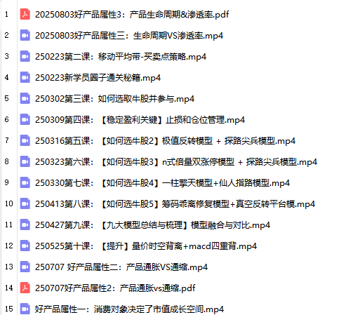 ├──20250803好产品属性3:产品生命周期&渗透率.pdf 3.14M ├──20250803好产品属性三:生命周期VS渗透率.mp4 46.47M ├──250223第二课:移动平均带-买卖点策略.mp4 44.65M ├──250223新学员圈子通关秘籍.mp4 43.98M ├──250302第三课:如何选取牛股并参与.mp4 57.11M ├──250309第四课:【稳定盈利关键】止损和仓位管理.mp4 54.14M ├──250316第五课:【如何选牛股2】极值反转模型 + 探路尖兵模型.mp4 65.68M ├──250323第六课:【如何选牛股3】n式倍量双涨停模型 + 探路尖兵模型.mp4 44.41M ├──250330第七课:【如何选牛股4】一柱擎天模型+仙人指路模型.mp4 35.14M ├──250413第八课:【如何选牛股5】筹码乖离修复模型+真空反转平台模.mp4 43.09M ├──250427第九课:【九大模型总结与梳理】模型融合与对比.mp4 50.56M ├──250525第十课:【提升】量价时空背离+macd四重背.mp4 47.86M ├──250707 好产品属性二:产品通胀VS通缩.mp4 38.44M ├──250707好产品属性2:产品通胀vs通缩.pdf 11.80M └──好产品属性一:消费对象决定了市值成长空间.mp4 43.71M